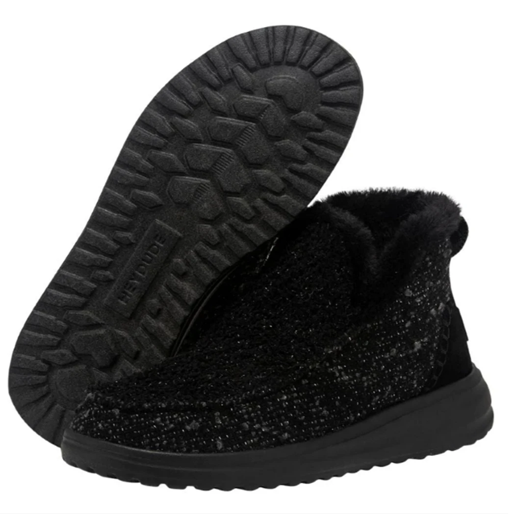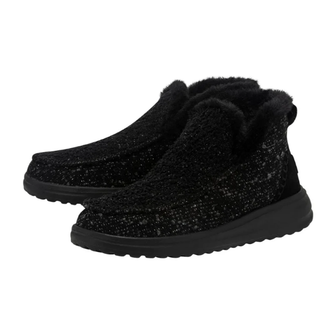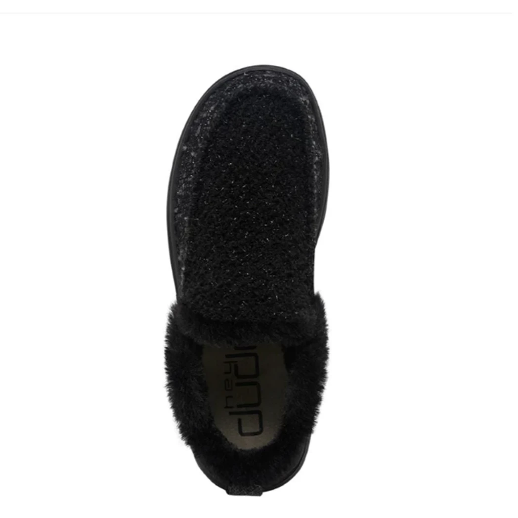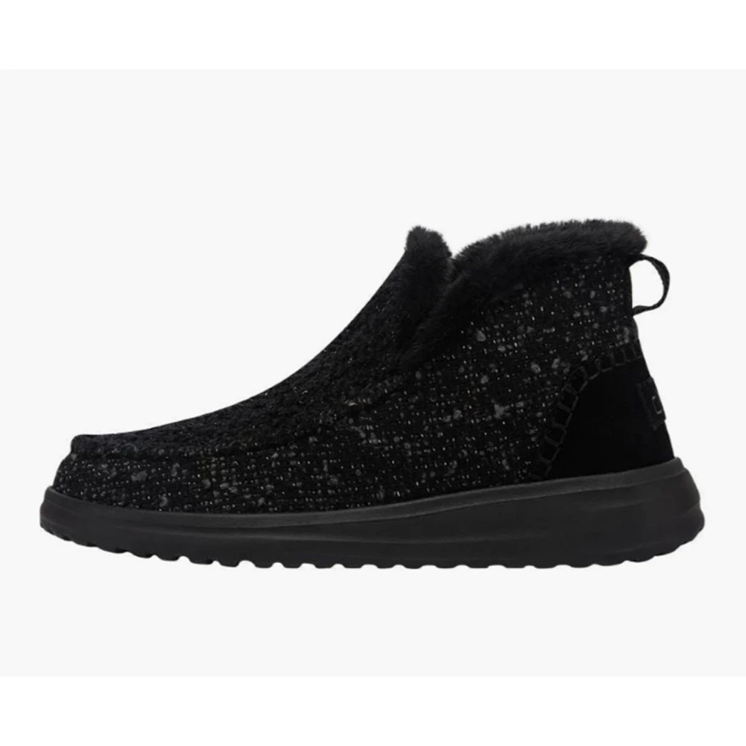 Slip into this ultra comfy Denny Sparkling Black moccasin-inspired bootie from Hey Dude! A soft, subtle bootie constructed in a soft wool blend with plush faux fur lining to keep your feet warm and dry all winter long. Finished off with contrasting, hand-stitched details and glitter-woven finishes throughout.