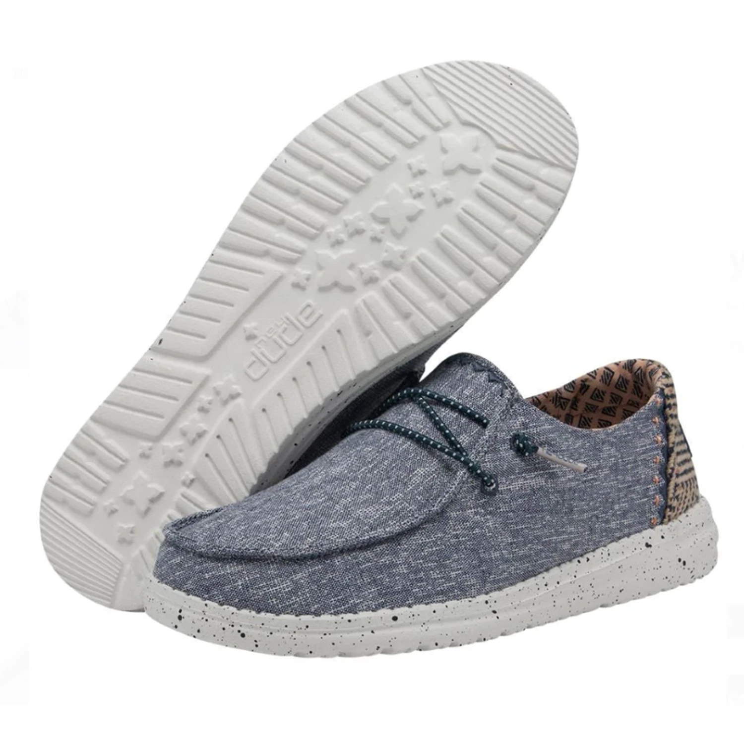 The Wendy Chambray Lapis Blue Moc from Hey Dude, features a soft chambray-coton material that is comfortable yet stylish! Created with a soft, chambray blend upper, finished off with an easy-on elastic lacing system and an ultralight outsole for extra comfort.Â